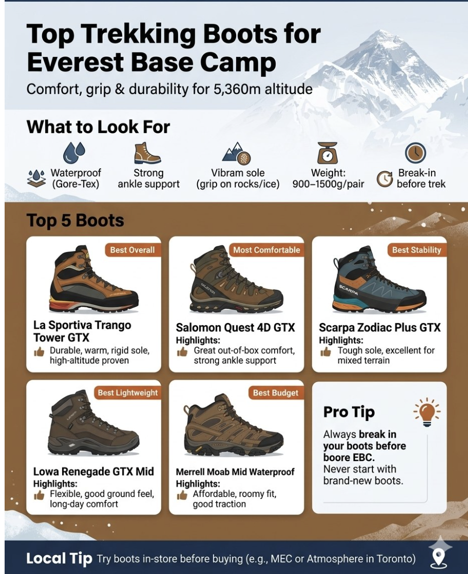 Your boots are your most important gear. Choose a well-broken-in trekking boot that offers comfort, stability, and support for long days on uneven terrain.