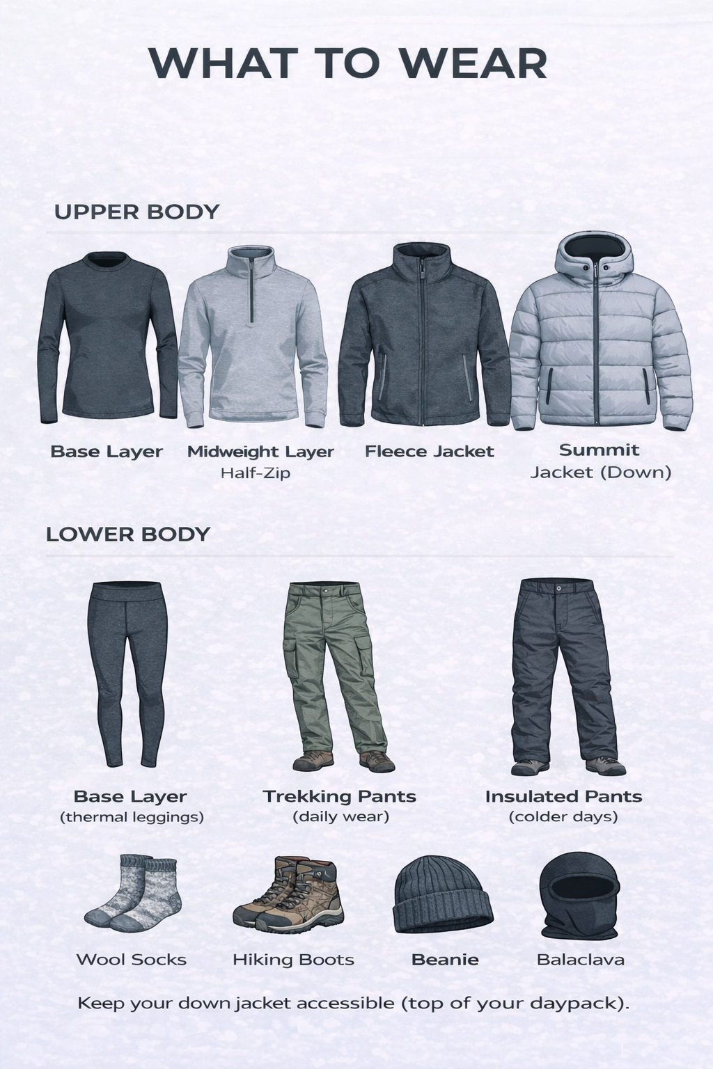 Down jacket: used during rest, early mornings, and high-altitude stops. This is not a hiking layer, it’s your recovery and protection layer